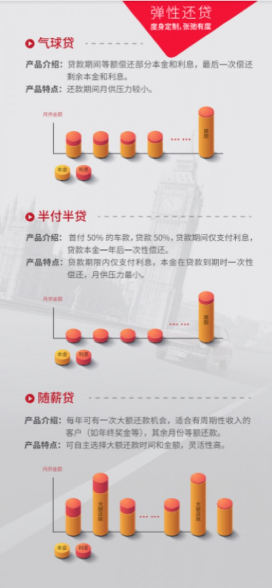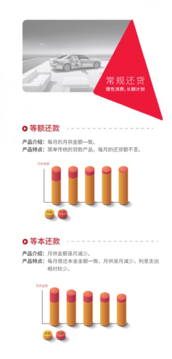 推出常规还贷、弹性还贷和积木贷三大系列产品,结合加装贷等个性化产品,从贷款期限、还款方式、首付比例等方面全方位满足购买者贷款需求。